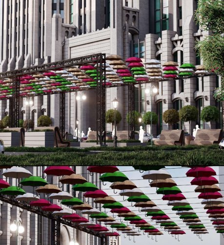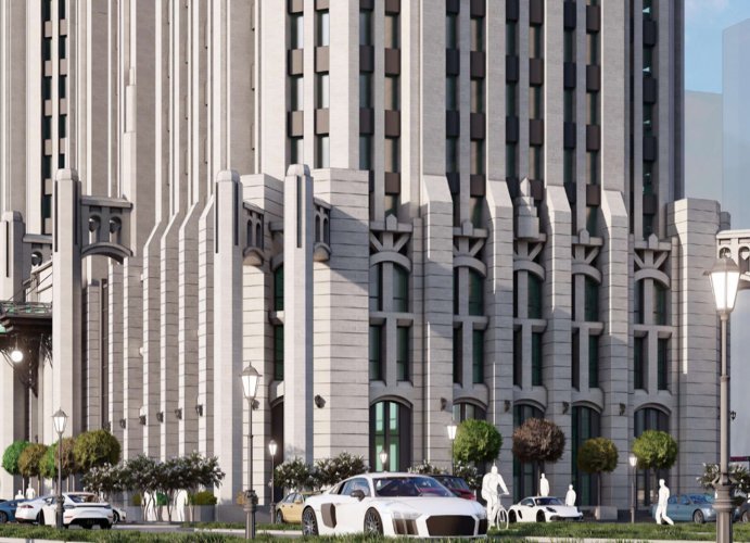 Первые этажи: коммерческие помещения (бутики, кафе, офисы). Верхние этажи: элегантные квартиры